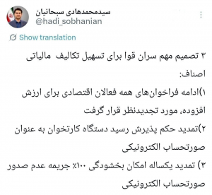 به گفته سبحانیان، سومین مصوبه شورای عالی سران قوا در راستای تسهیل تکالیف مالیاتی اصناف، تمدید امکان بخشودگی ۱۰۰ درصدی جریمه عدم صدور صورتحساب الکترونیکی از سوی مشاغل و اصنافِ فراخوان شده در سامانه مؤدیان تا یک سال آینده است.