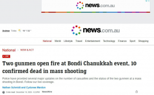به گزارش روز یکشنبه جارپرس از ایرنا، تارنمای رسانه استرالیایی «نیوز دات کام استرالیا» (news.com.au) نوشت: دو فرد مسلح در مراسمی که در ساحل بوندی (حومه سیدنی) برگزار بود تیراندازی کردند و ۱۰ نفر کشته شدند.